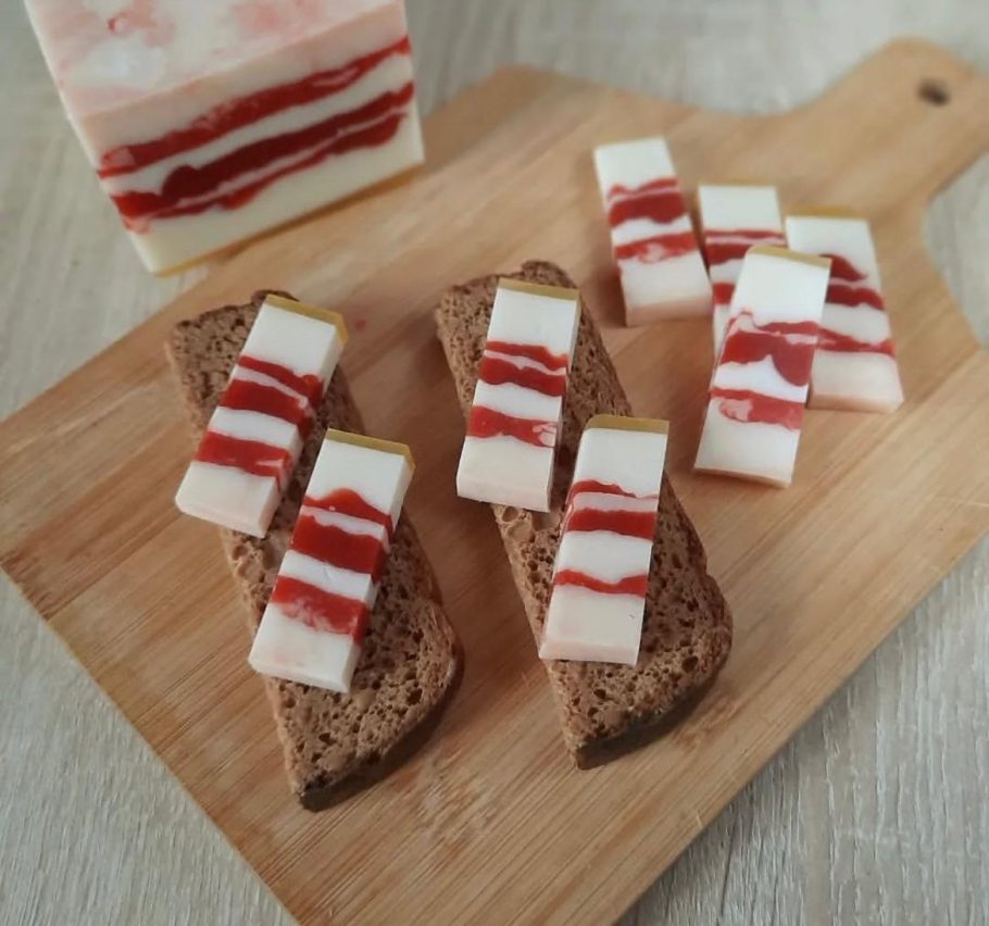 Мастер поделилась, что ее мыло частенько путают с настоящими блюдами. Бывает, что на ярмарках мимо проходящие ребята откусывают манящие фрукты и соленые огурчики. А случалось и такое, что мыльными сладостями стол накрывали.